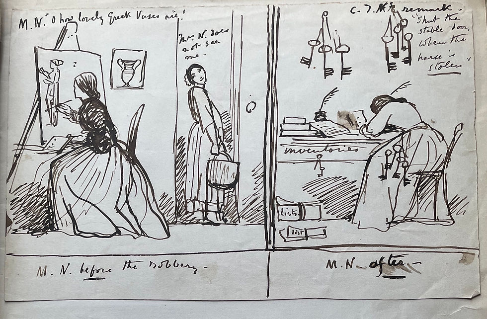 She had generally also lived with one loyal servant and an occasional cook with house girls that came and went to do the scullery chores, as is attested from letters to her mother. In her new house, it seems that she had at least a cook / housekeeper and live in domestic servant. At some point in their married life, a theft occurred at their house in Gower Street and Mary makes two sketches of her showing the before and after. She is intent on her art work and a book is on the floor before the theft occurred and then dedicated to the keys and inventories of plate afterwards.